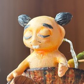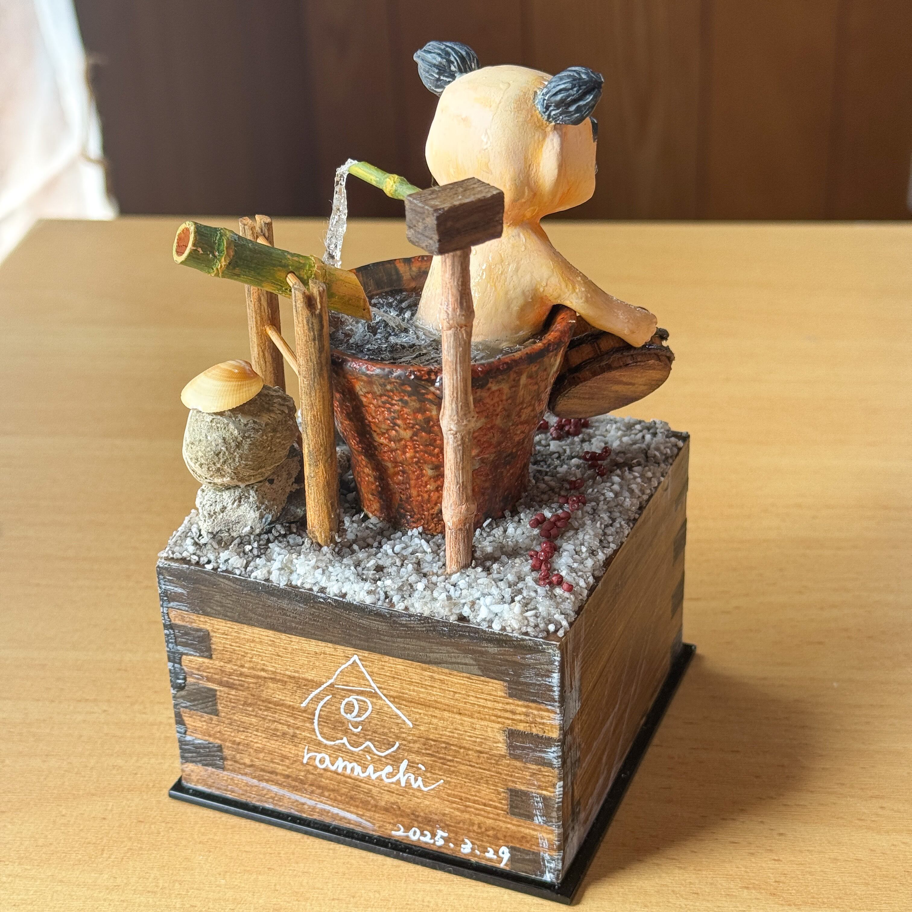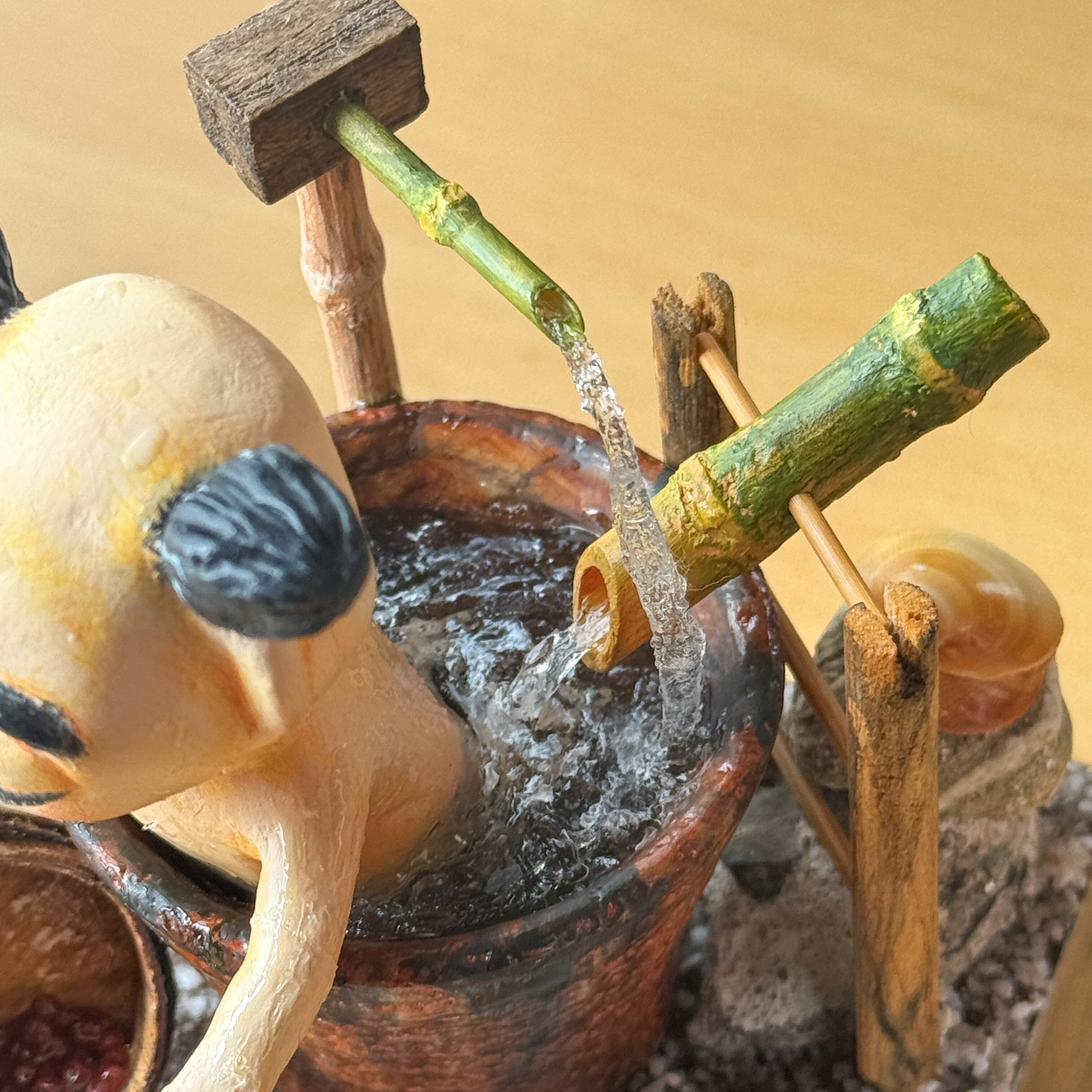 そこで、和の風情を感じさせる「鹿威し(ししおどし)」を取り入れ、あえてその中でくつろぐ“小豆あらい”を表現。ちょっとシュールで、癒される世界観を目指しました。