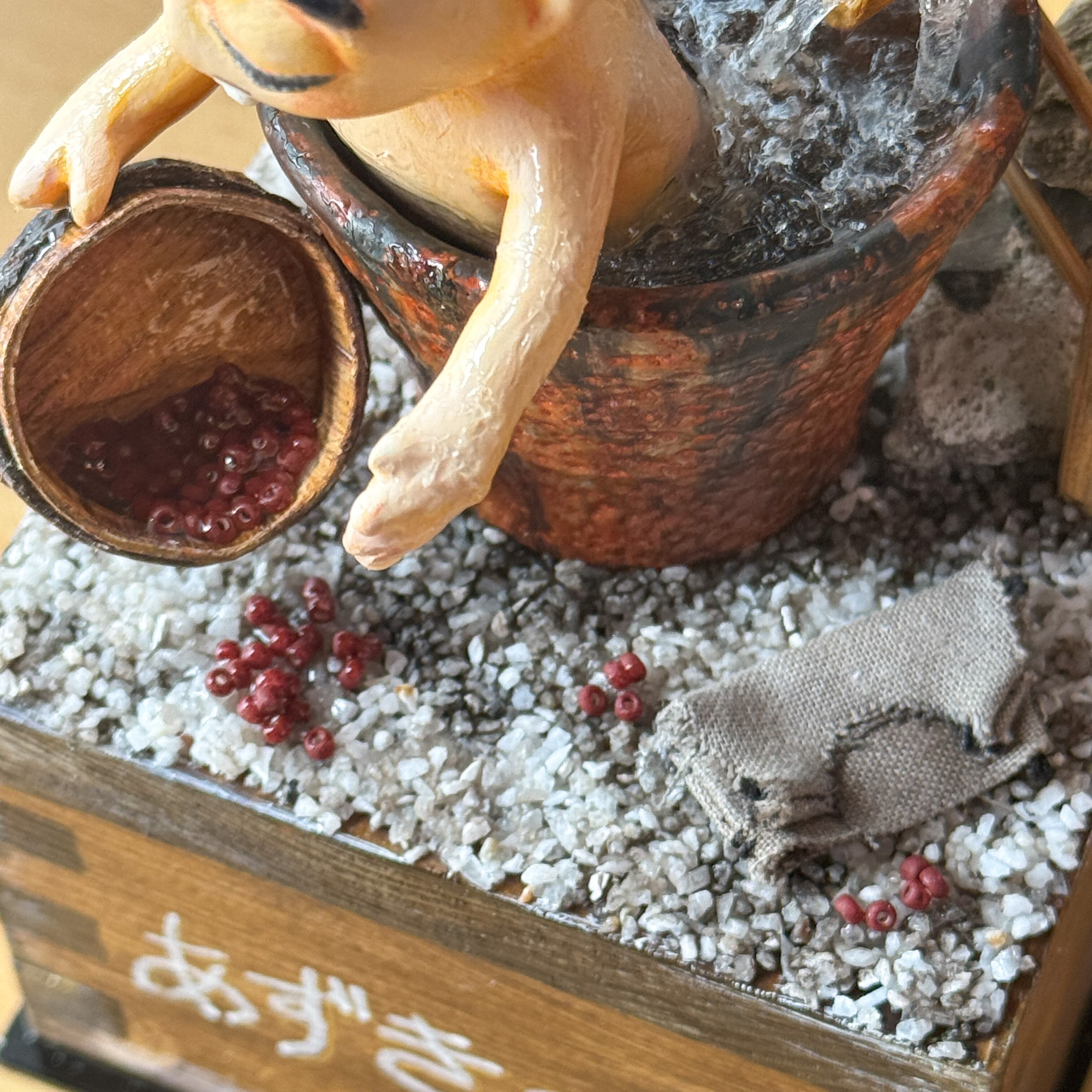 小豆は、ビーズを一粒一粒塗装して再現。地面に転がっている様子で、彼が鹿威しに近づいた形跡を物語っています。