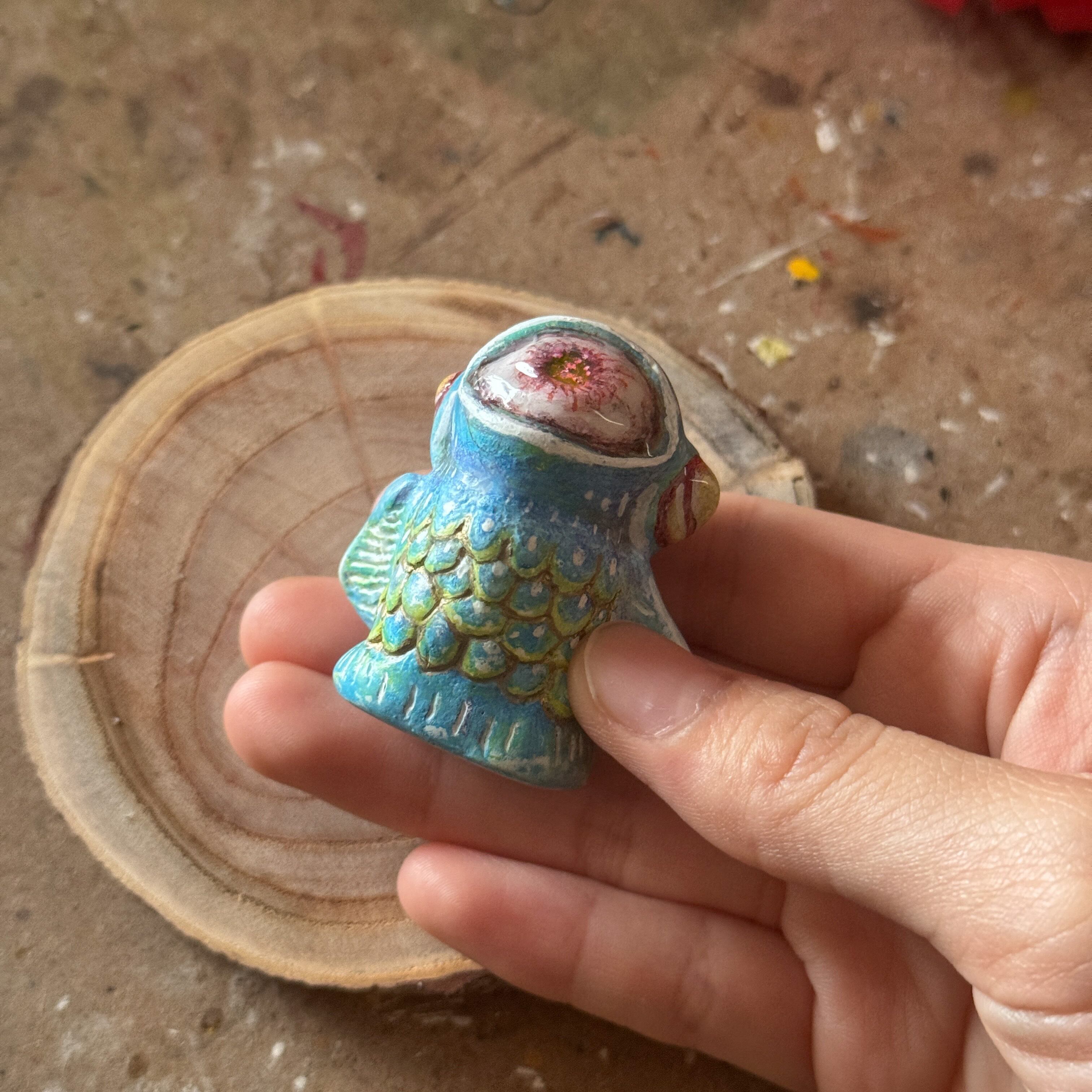 レジンで型取りしてやすりがけ後、アクリル絵の具で下地を描き、色鉛筆で色を重ねて仕上げています。