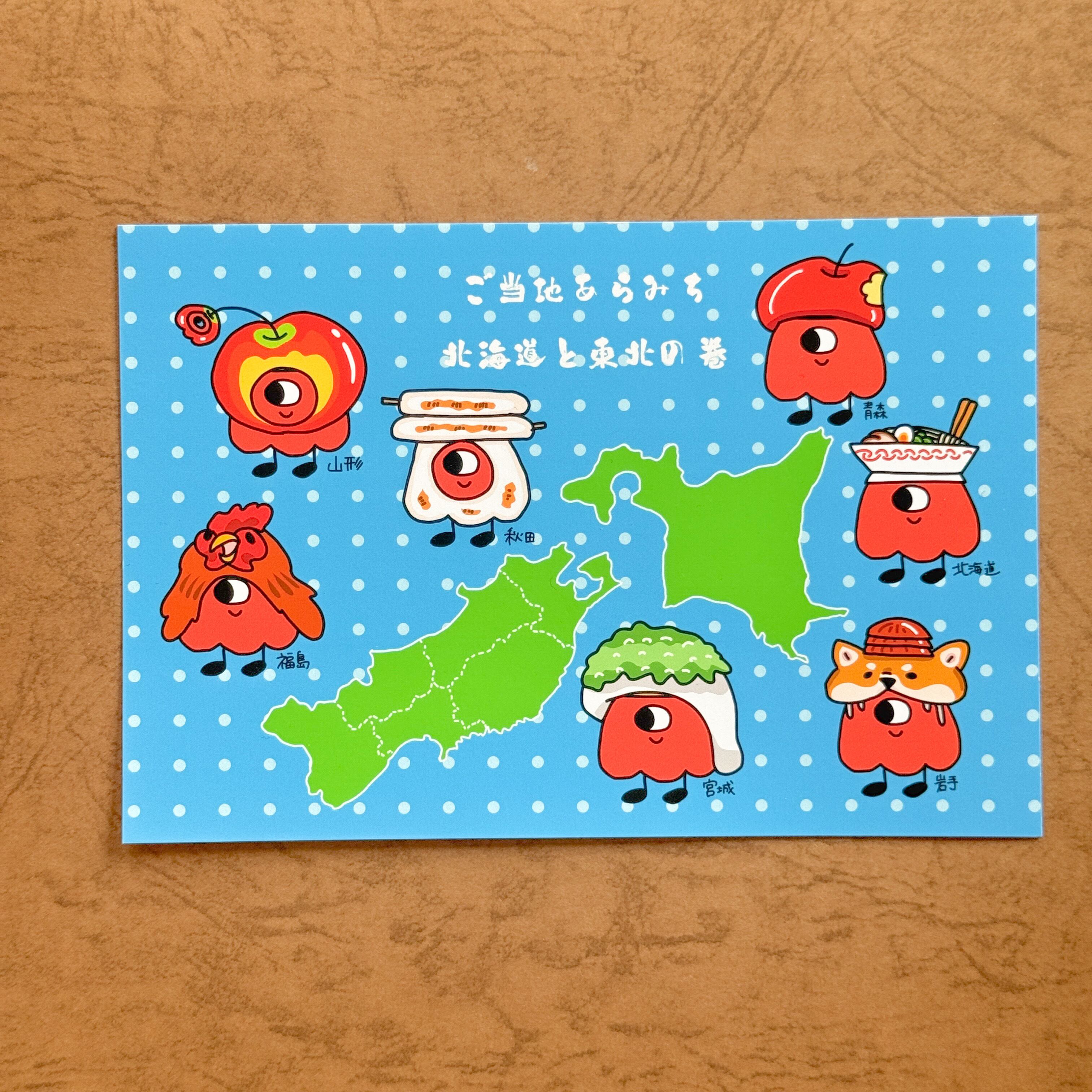 北海道と東北地方の名物を身にまとったあらみちたちが、ポストカードになってにぎやかに彩ります。