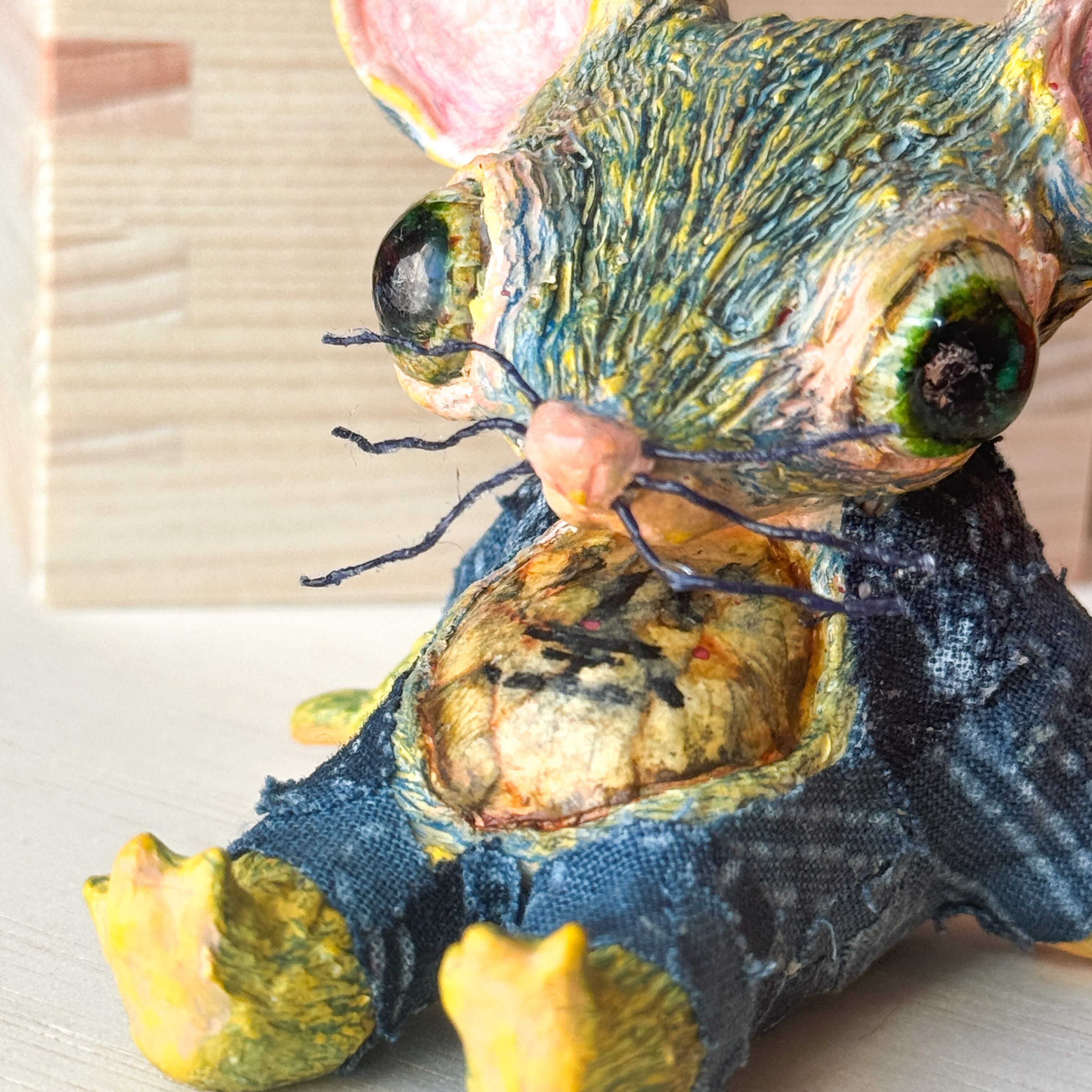 The body was painted in a golden yellow hue using acrylic paint. After drying, layers of blue-toned colored pencils were applied and blended with water to create a deep and nuanced expression. The handcrafted texture enhances the unique charm of the piece. The eyes are made of resin, providing a marble-like depth that captivates the viewer.